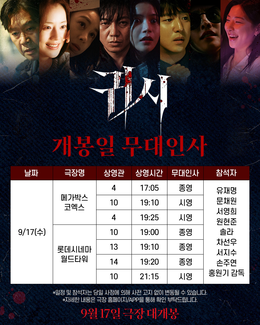 😱 바로 <귀시>인데요, 개봉일인 9월 17일, 배우들과 감독님이 직접 관객들을 만나러 온다는 소식입니다!